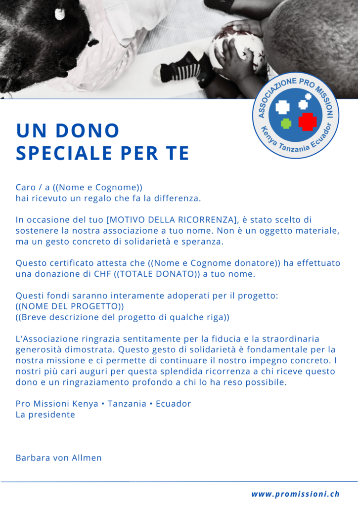 Sostieni i nostri progetti con un certificato di donazione personalizzato da regalare a chi ami.